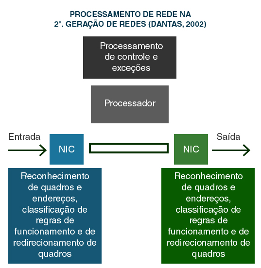 No modelo tradicional de redes há retenções em virtude da governança e segurança das organizações e as aplicações dos usuários são submetidas aos pacotes de firewall e tradução de endereços (network address translation NAT), que geram um retardo às aplicações de rede. As redes de nova geração dão maior prioridade para as aplicações de rede utilizando os processadores de rede (network processors NP), que são roteadores, switches e interfaces para acelerar o processamento das solicitações. Na 2ª Geração de sistemas de rede, há o processamento de quadros elétricos, endereçamento de rede, classificação e reencaminhamento de pacotes efetuados na placa, cabendo ao processador central o controle e tratamento de exceções.