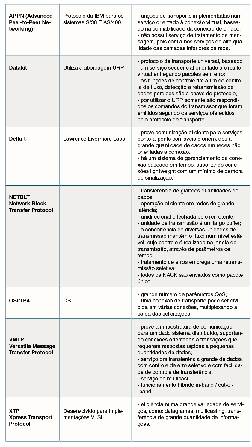 | 6.4 Protocolos de transporte Para incrementar a utilização da largura da banda através de conexões eficientes de transporte há necessidade de novos protocolos e melhoria dos existentes. Há protocolos que foram projetados com o objetivo de alto desempenho, como demonstrados na tabela a seguir.