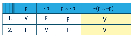 Conclusão: a proposição ~(p ∧ ~p)é uma Tautologia, devido ao resultado final possuir somente valores lógicos V.