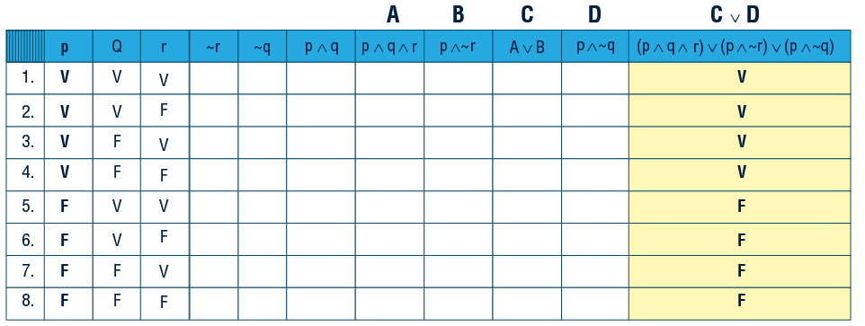 seria bem mais simples que a tabela de (p∧q∧r)∨(p∧~r)∨(p∧~q), sendo que