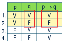 A relação das estruturas de decisões com uma proposição condicional é restrita às linhas em que o valor de p é verdade, conforme destacado abaixo, pois os comandos de dentro da estrutura algorítmica somente são executados quando a condição for satisfeita, ou seja, quando o seu valor for uma verdade.