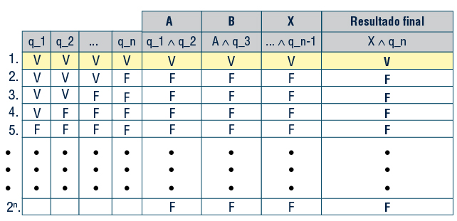 A seguir, a linha 1 da tabela verdade de (q_1 ∧ q_2 ∧ ... ∧ q_n) representa a execução de todos os comandos do bloco, simbolizando o que deve acontecer quando a condição for Verdade.