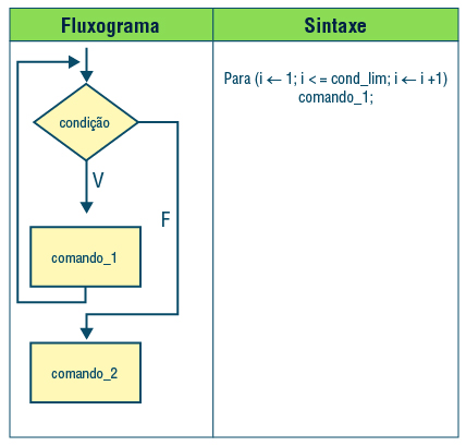 6 - Estruturas de repetição e a lógica das proposições A lógica do raciocínio baseado na veracidade de uma condição é mantida nas estruturas algorítmicas de repetição, mas as referidas estruturas acrescentam a capacidade do programa repetir a mesma tarefa um número desejado de vezes. Dessa forma, as estruturas de repetição são também compostas por um ou mais comandos, cuja execução depende da satisfação de uma condição. No entanto, o controle quanto à satisfação da condição pode ser tanto pela análise simples da veracidade, como pelo estabelecimento de um intervalo que limite o quanto a repetição será executada. • Estrutura Para