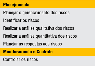 | h) Riscos O gerenciamento dos riscos tem por objetivo identificar os possíveis eventos que podem causar malefícios ou benefícios ao projeto, caso se concretizem. A ideia é reduzir o impacto negativo dos riscos “negativos” e ampliar os “benefícios” dos riscos “positivos”. O risco do projeto é fruto da incerteza que existe em todos os projetos. A maior parte dos processos do gerenciamento do risco está localizada no grupo de planejamento do projeto, conforme se pode observar na lista abaixo: