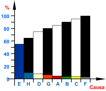 Convém observar que, no gráfico de colunas (%), estas decrescem da esquerda para a direita. A coluna que se localiza mais à esquerda é a mais importante, pois está ocasionando a maior perda de dinheiro. De acordo com essa análise, o elemento "E" deverá ser estudado em primeiro lugar, visando à sua eliminação ou à sua redução a valores bem menores.