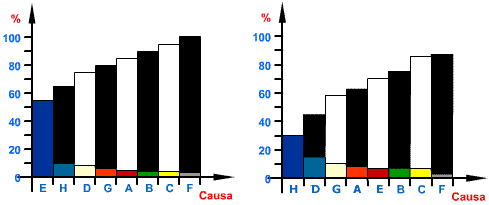 A figura mostra o novo gráfico de Pareto feito para confirmar a redução de problemas da causa "E" . Nele pode-se observar que a causa mais importante passou a ser a "H", ao passo que a "E" passou para o quinto lugar. As colunas alteraram o tamanho porque o gráfico representa percentagens com relação ao custo total. Compare os dois gráficos.